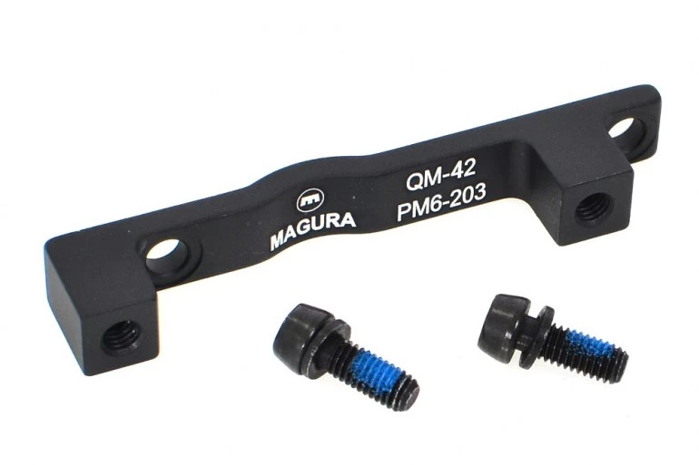 Brake mounting adapter from Magura model QM 42. The QM 42 adapter is designed for PM mounting on a frame or fork as well as a brake caliper. With this adapter, you can reduce the attachment of the 160mm (PM 6 “) fork to the 203mm (PM 8 “) disc, or the 160mm (PM 7 “) frame to the 203mm (PM 8 “) disc. Resp. this is a reduction thanks to which you can increase the diameter of the wheel by 43mm. The adapter is made of very strong aluminum and supplied with M6 torx 25 screws for mounting on a frame or fork.