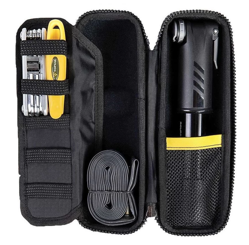 Durable case for tools and other small items that can easily hold a mini pump (maximum 22 cm in length), mini tools, CO2 inflator, 25g CO2 cartridge, mounts and spare MTB tube up to 29 “x 1.9 / 2.35” .