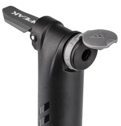 Powerful pocket pump with manometer, aluminum body and plastic handle, uses both strokes to compress the air and save time and effort.