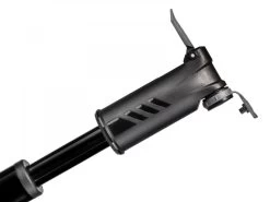 Powerful pocket pump with aluminum body and plastic handle, uses both strokes to compress the air and save time and effort.