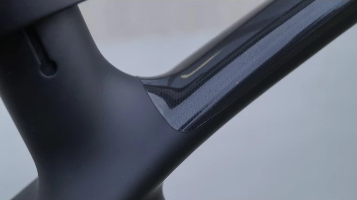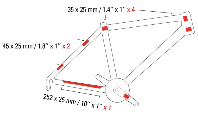 Set of translucent protective stickers on a bicycle frame.